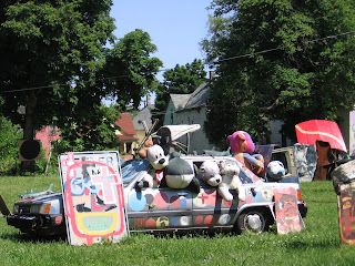 The graffitied houses also force us to reread history: 1967 (the year of the Detroit riots, after which most whites fled the city); OJ; Oklahoma City. The word scatter matches the conceptual scatter a spectator feels when she sees these houses. To say nothing of the panic she felt when Tyree himself appeared and demanded to know "the purpose of art!" In a city that was born and thrived for a time on use value, the relative uselessness of these houses--no one lives in them, after all--seems especially striking. Down the street a ways, my cousin Bill, his daughter, and I ran into some art grad students from Wayne State. They wondered where to find old tires for a new project; some were setting out in clunkers to hunt down their treasure. We felt confident they would find plenty. Recycling for art's sake, where art cannot be for its own. Reminds me of the alternative economy of Tinfish journal covers, the last of which was made of real estate magazines, the kind you can pick up for free around town. They point at the artifice of our (of any?) housing market, as the wacky beauty of the Heidelberg project highlights Detroit's destruction by forces beyond its control.